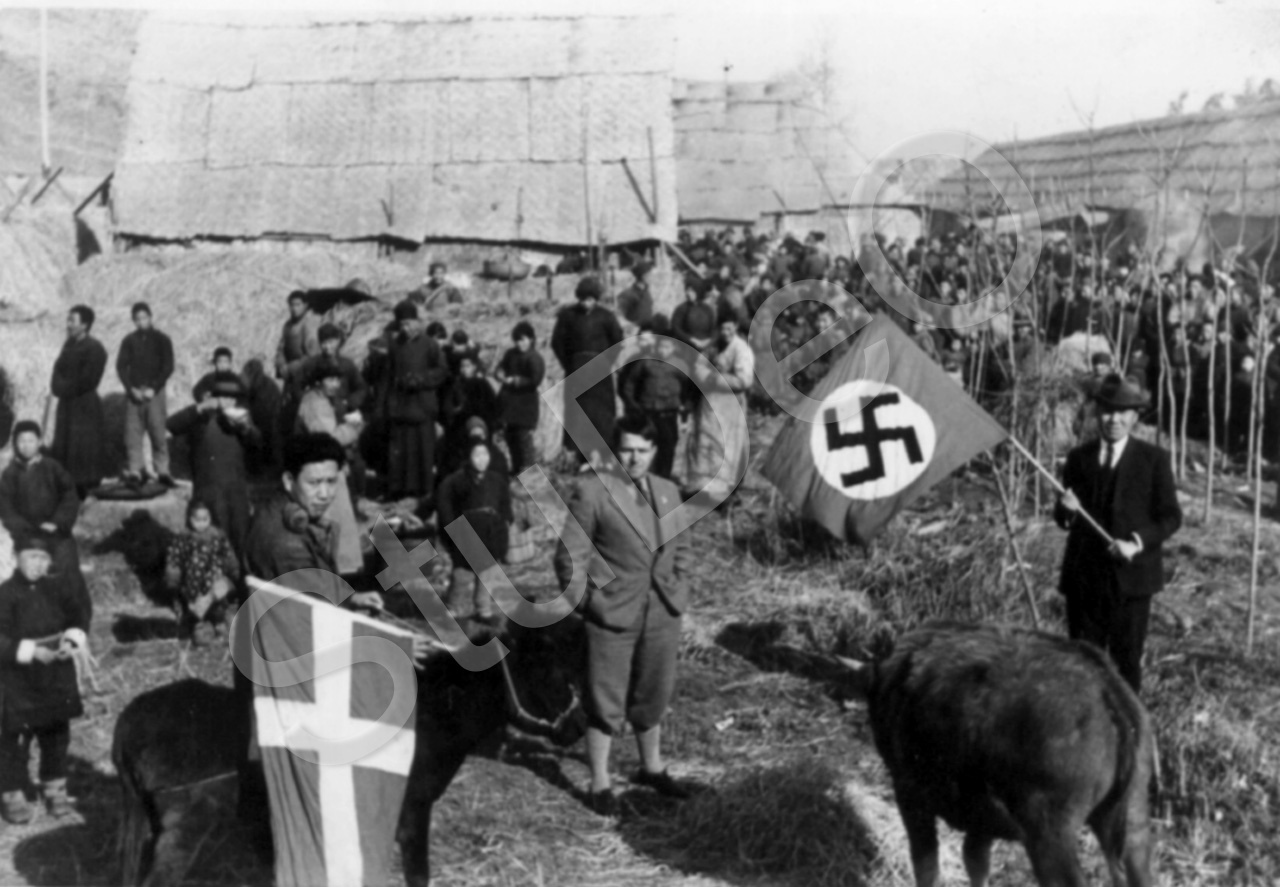 Beschreibung: Chinesischen Flüchtlinge auf dem Gelände der Kiang Nan Cement Works in Hsi Sha Shan. Wohnen in notdürftigen Hütten. Die deutschen und dänischen Fahnen sollten vor japanischen Angriffen schützen. Mitte vorne Dr. Karl Günther. Die Hakenkreuzfahne hält ein chinesischer Mitarbeiter Karl Günthers in Händen.