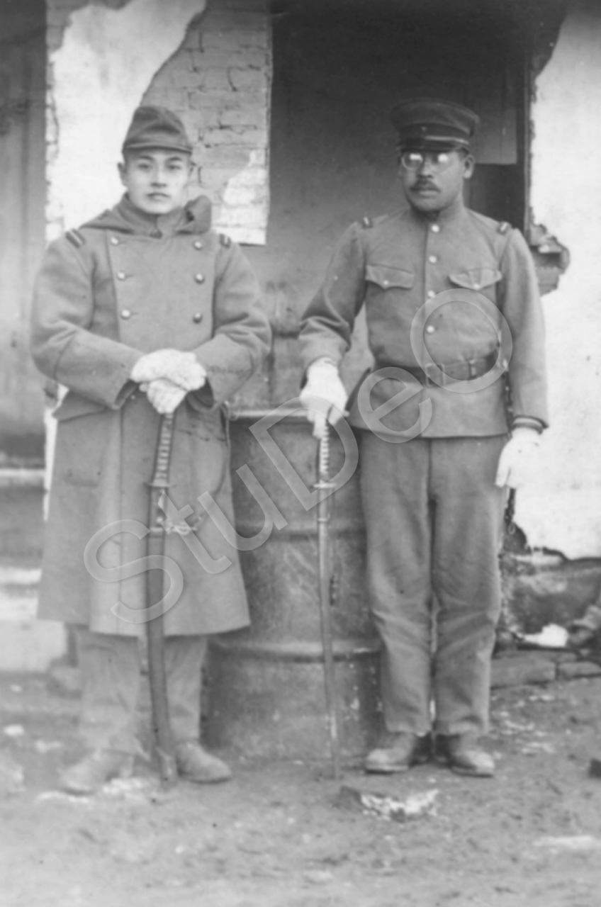 Beschreibung: Zwei japanische Offiziere nach der Einnahme von Nanking durch die Japaner. Möglicherweise auf dem Geländer der Kiang Nan Cement Works in Hsi Sha Shan.