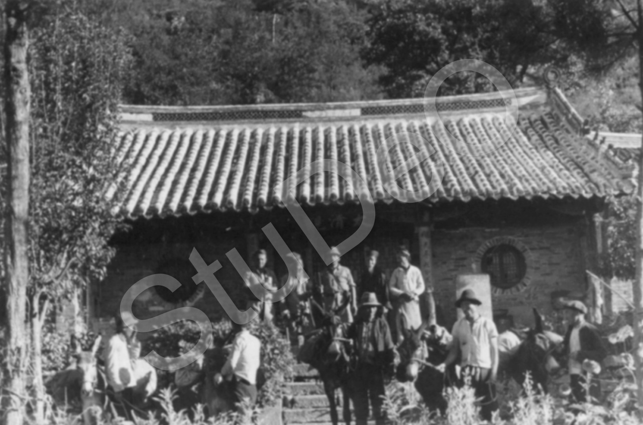 Beschreibung: Dr. Karl Günther auf der Jagd mit japanischen Soldaten und chinesischen Esel­treibern, vermutlich vor einem Bergtempel in der Umgebung von Nanking.