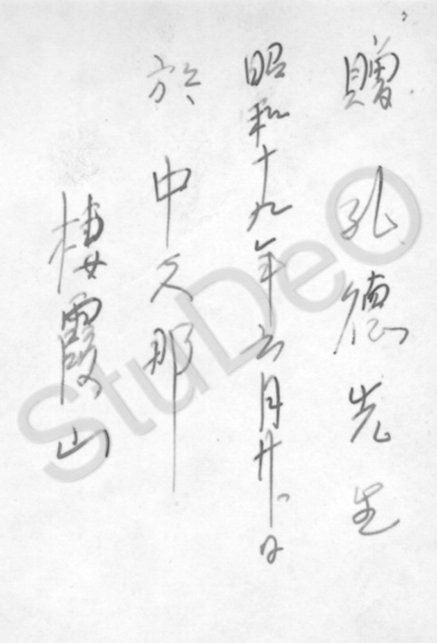 Beschreibung: Rückseite des Fotos vom japanischen Offizier P0697. Bedeutung der Spal­ten von li. 1. Hsi Sha Shan, 2. Name des Offiziers, 3. Datum 20. Juni 1938, 4. Widmung an Karl Günther.
