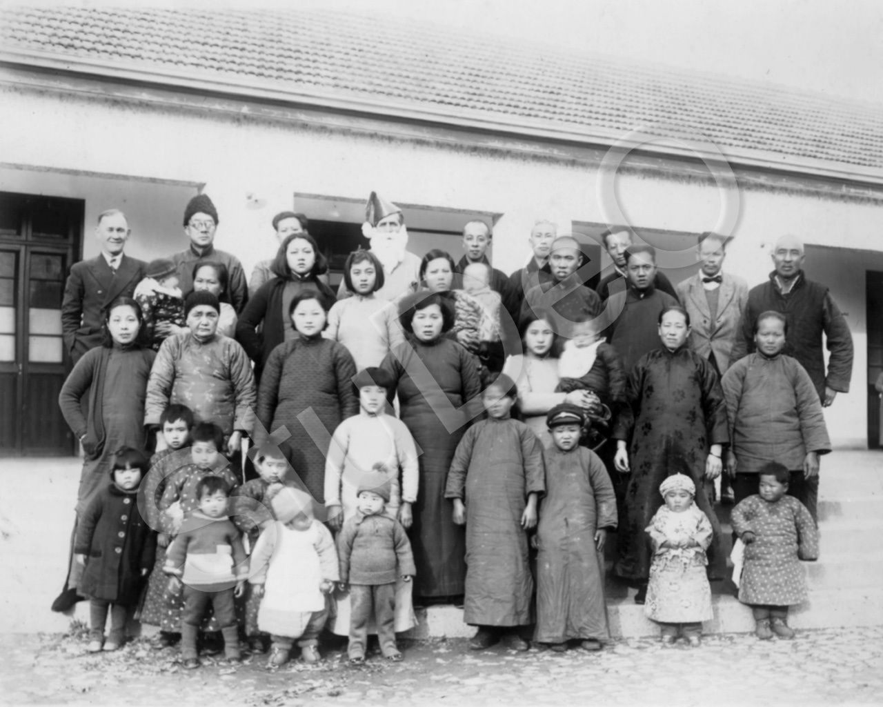 Beschreibung: Belegschaft der Kiang Nan Cement Works in Hsi Sha Shan mit ihren Familien zu Weihnachten. Hinten (mit Fliege) Lao Shen.
