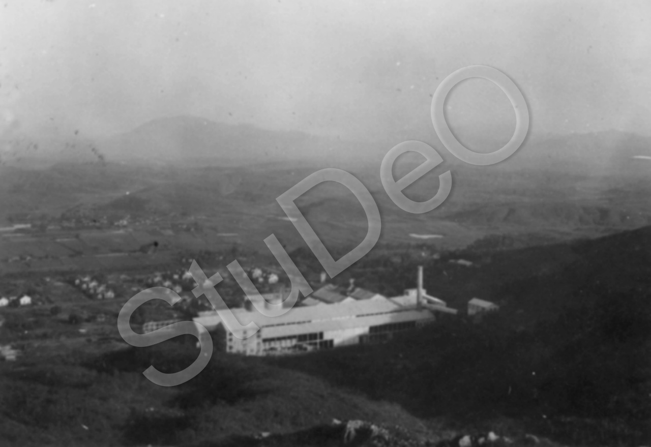 Beschreibung: Das Fabrikationsgebäude und Nebenhäuser der Kiang Nan Cement Works. Umgeben von Hsi Sha Shan Bergen.