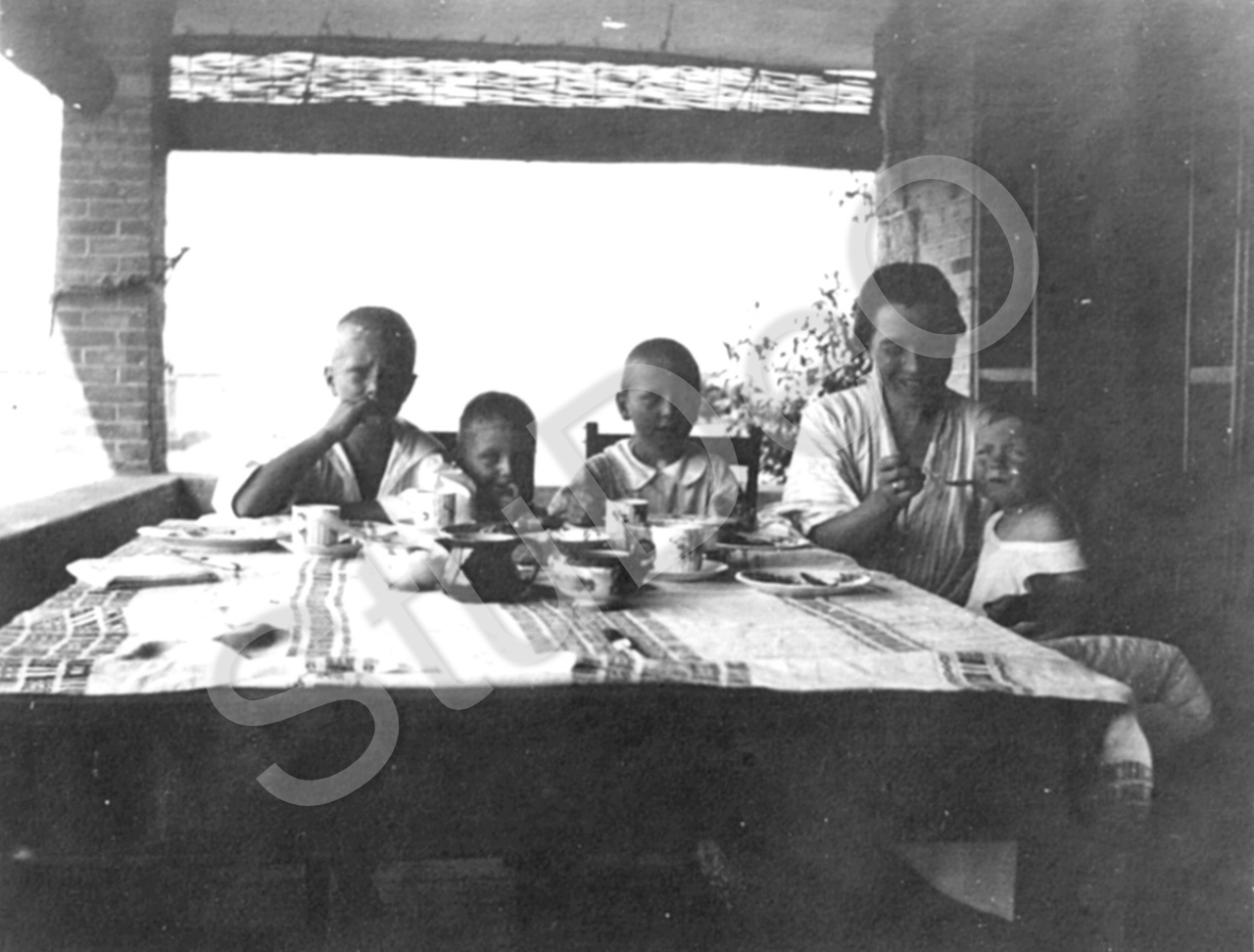 Beschreibung: Marie Balser mit ihren 4 Söhnen Karli, Christian, Helmut und Johannes auf der Hausterrasse beim Essen.