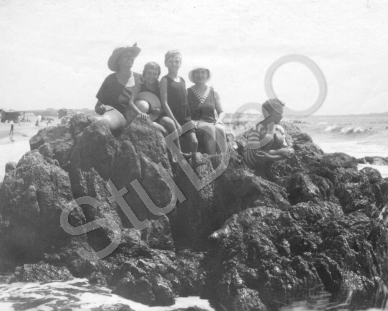 Beschreibung: Helene Gerngroß mit Kindern aus dem Felsen. Im Hintergrund Meer und Strand.