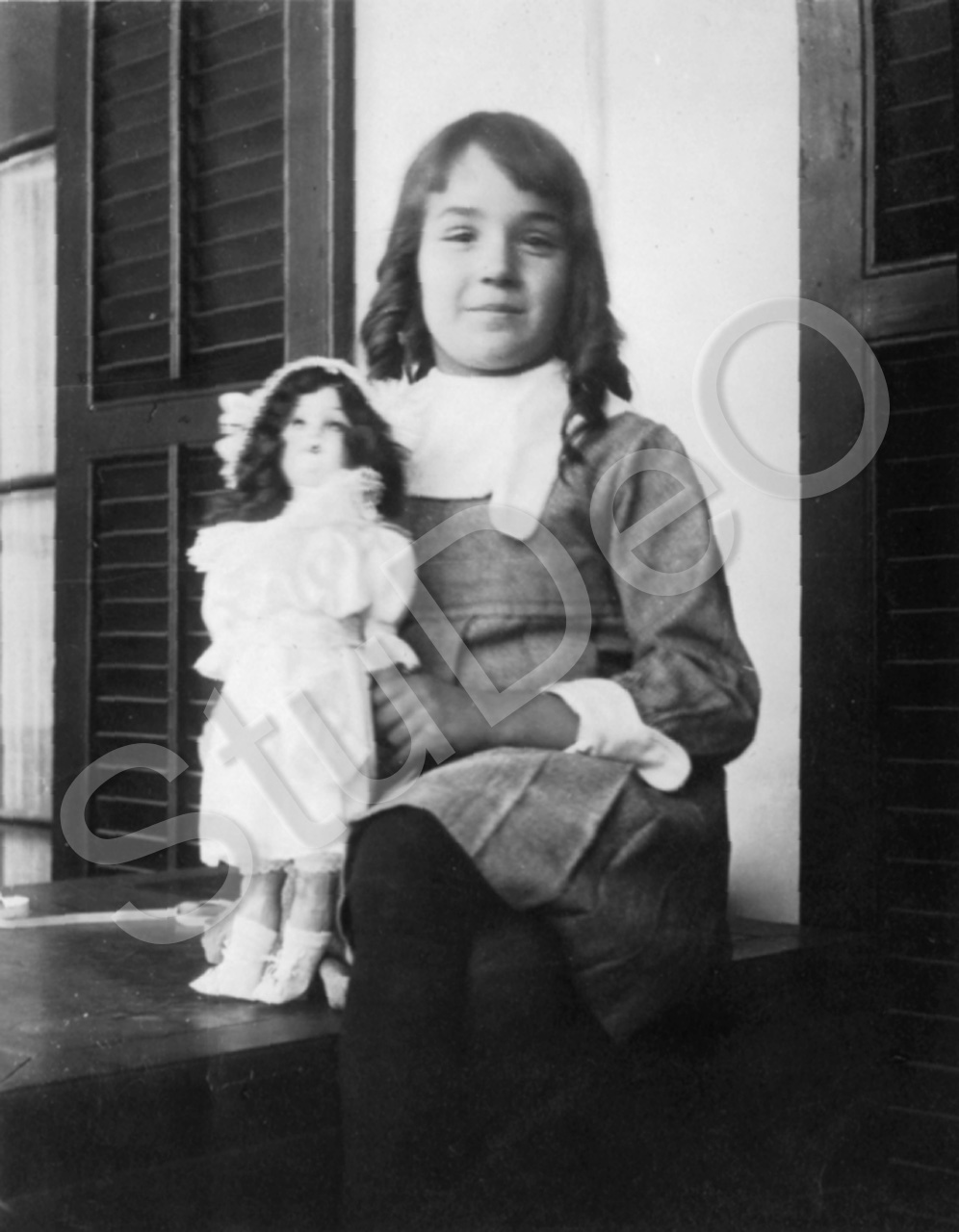 Beschreibung: Barbara Gerngroß (ca 8 J.) mit Puppe am Fenster.