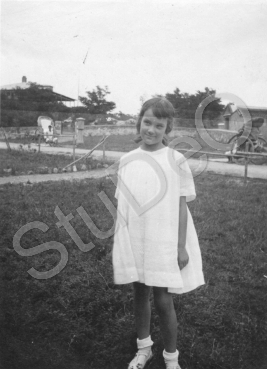 Beschreibung: Barbara Gerngroß (7 J.) vor dem Strandhaus. Wartende Rikshas.