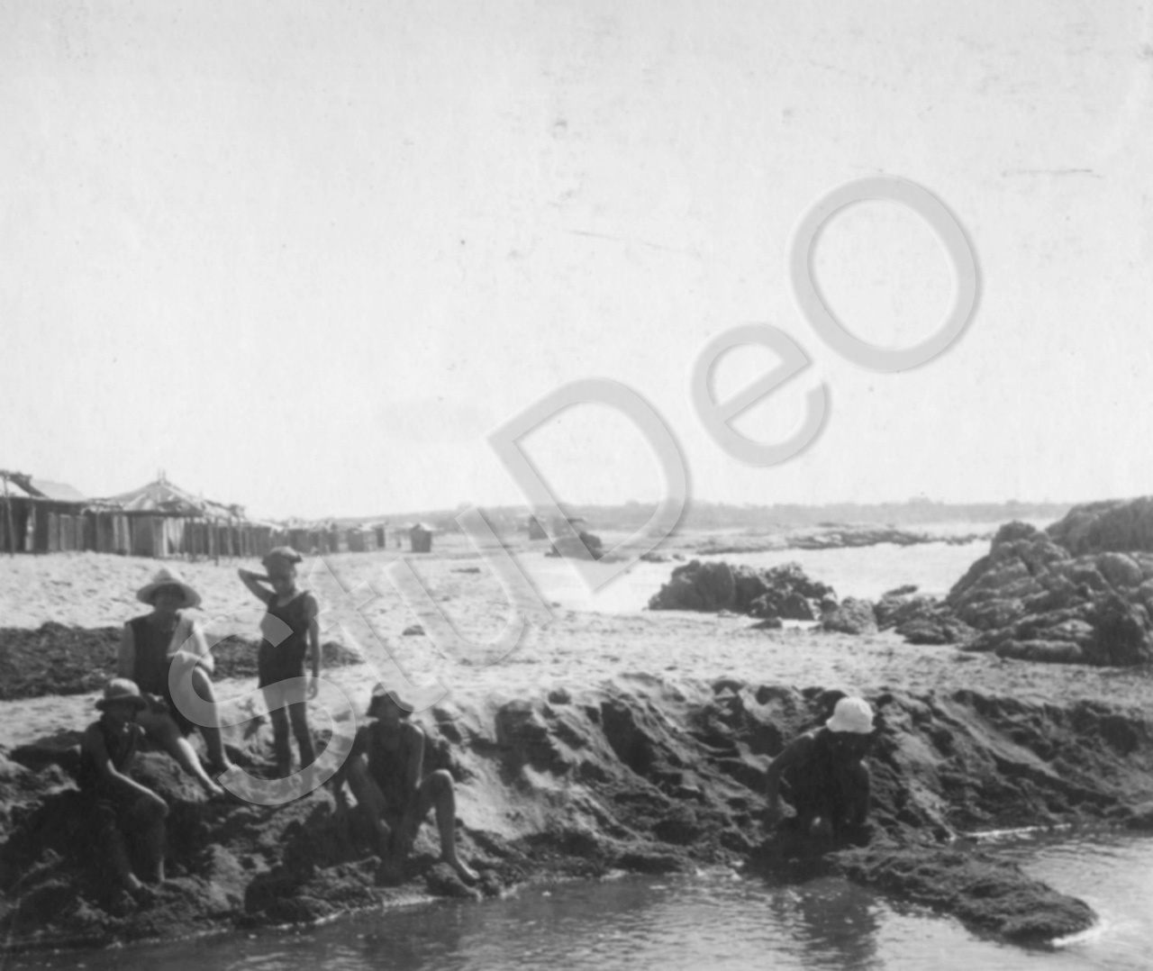 Beschreibung: Rocky Point. Felsen, Strand, Stranhütten. Familie Gerngroß.