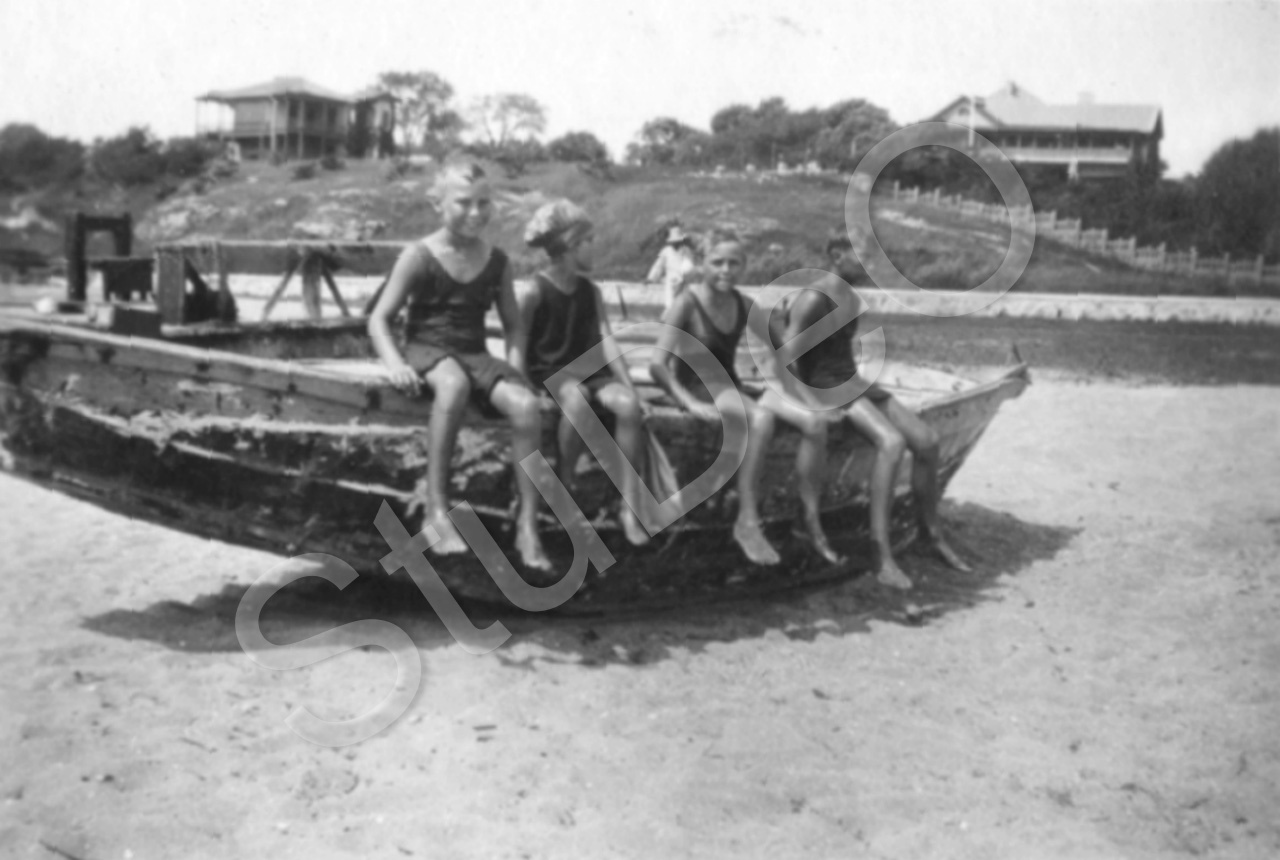 Beschreibung: Vlnr. Alec Siemssen und Barbara, Paul und Richard Otto Gerngroß auf einem Boot sitzend. Im Hintergrund Häuser. Rocky Point.