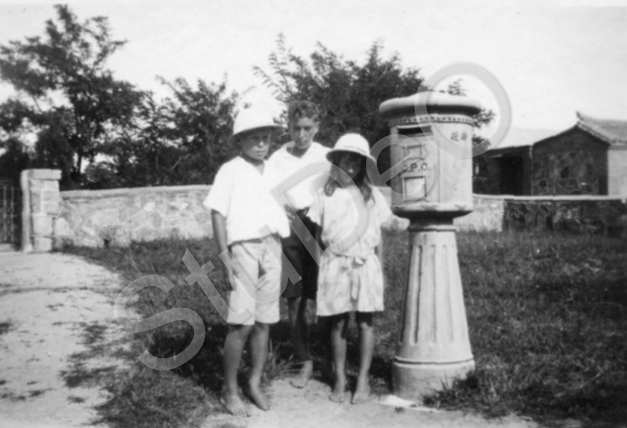 Beschreibung: Paul, Richard Otto und Barbara Gerngroß an einem Postkasten.