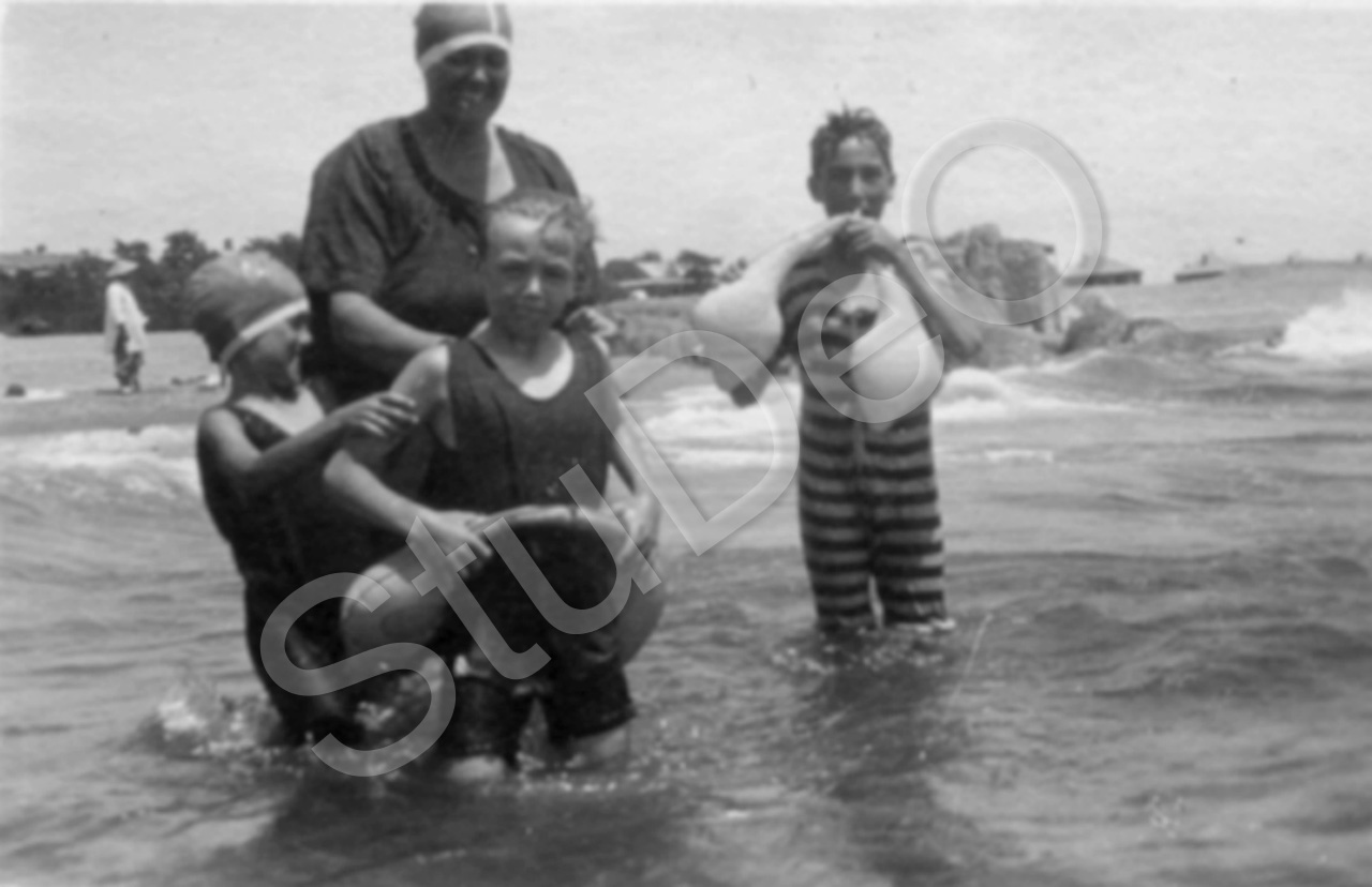 Beschreibung: Frau Gerngroß mit ihren Kindern am Meer mit Blick auf Strand Häuser.