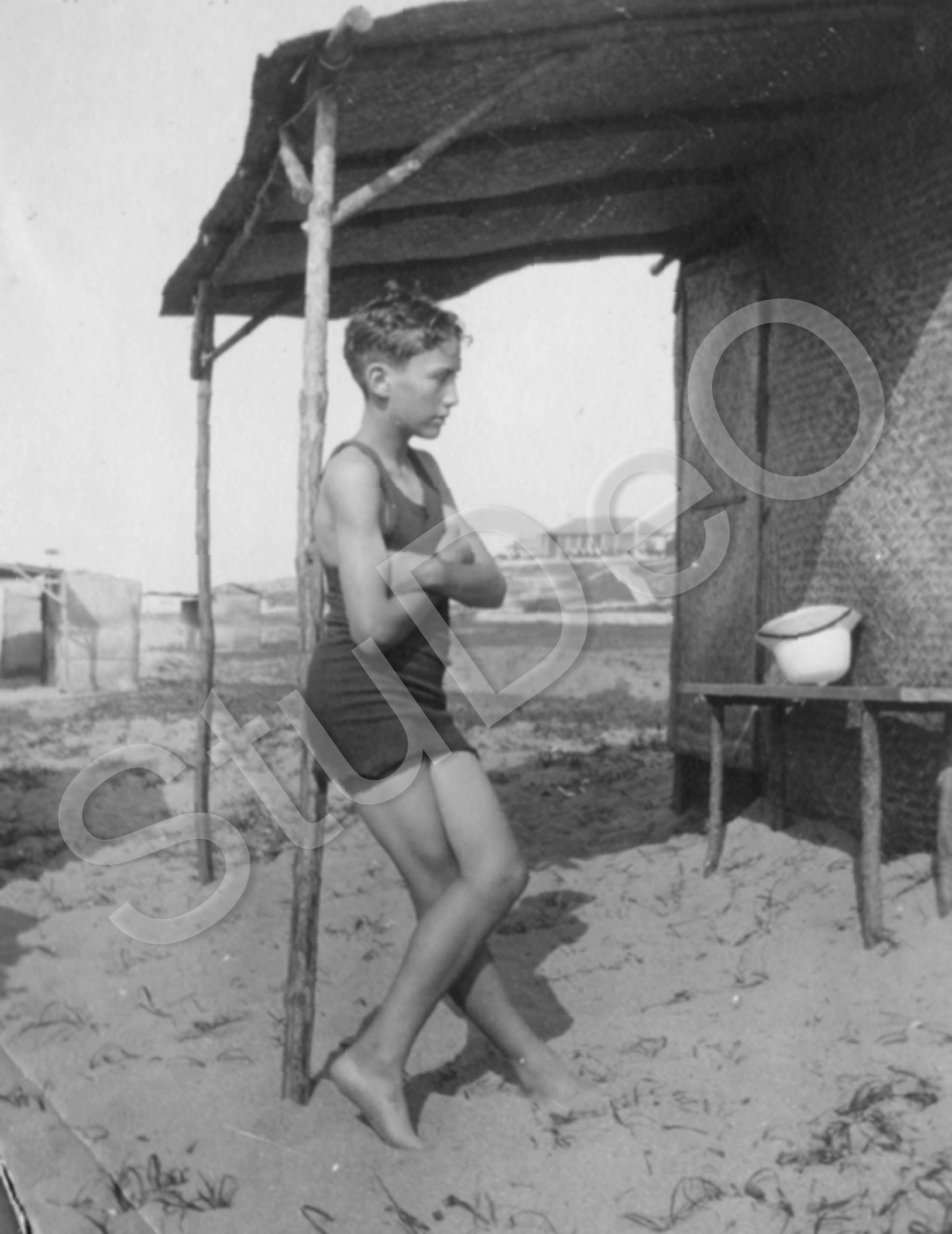 Beschreibung: Richard Otto  Gerngroß lehnt gegen Strandhüttenpfeiler. Im Hintergrund Haus.