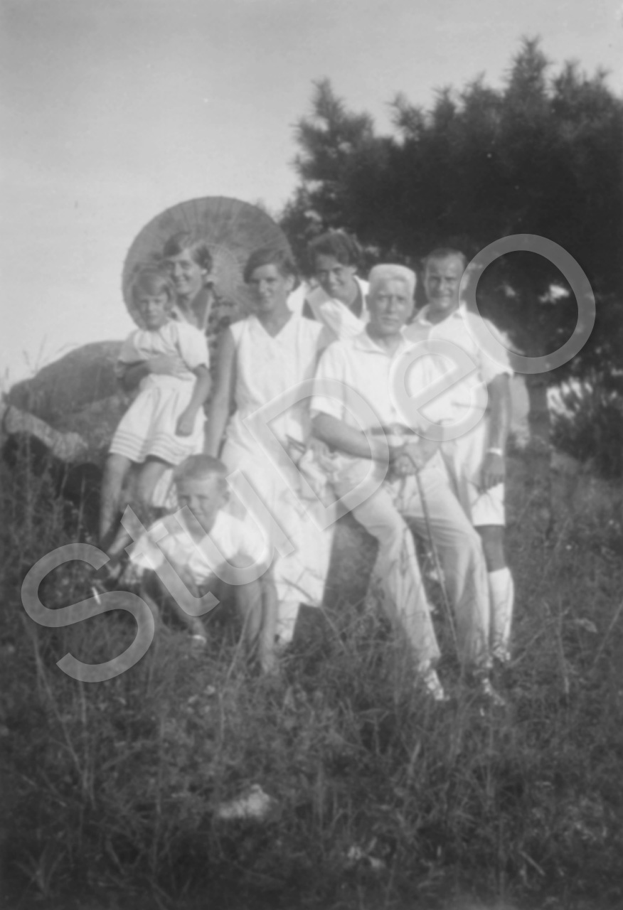 Beschreibung: V.l.n.r. ?, Olga Kleemann, ?, Hertha Utech, Otto Kleemann (Vater von Olga), Hans Utech im Sommer.