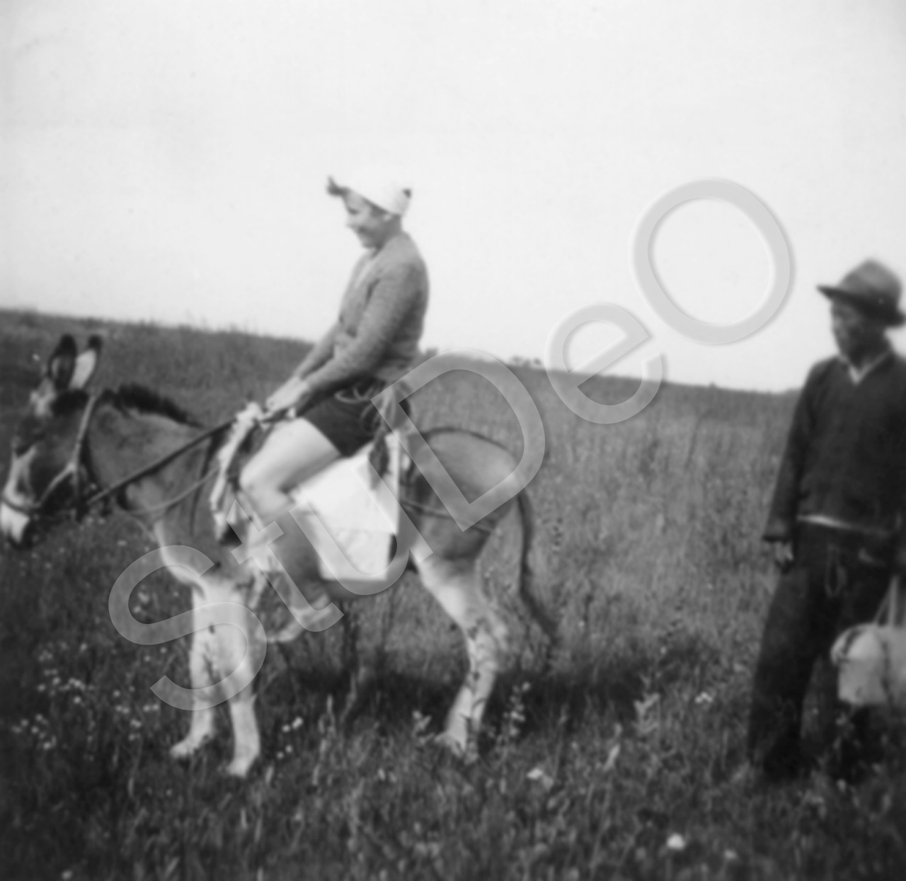 Beschreibung: Annelene Günther auf dem Esel. Annelene Günther dazu „Auf Schne­pfen­jagd. Ein Vogel hängt bereits am primitiven Galgen. Rechts mein Eseltreiber“.