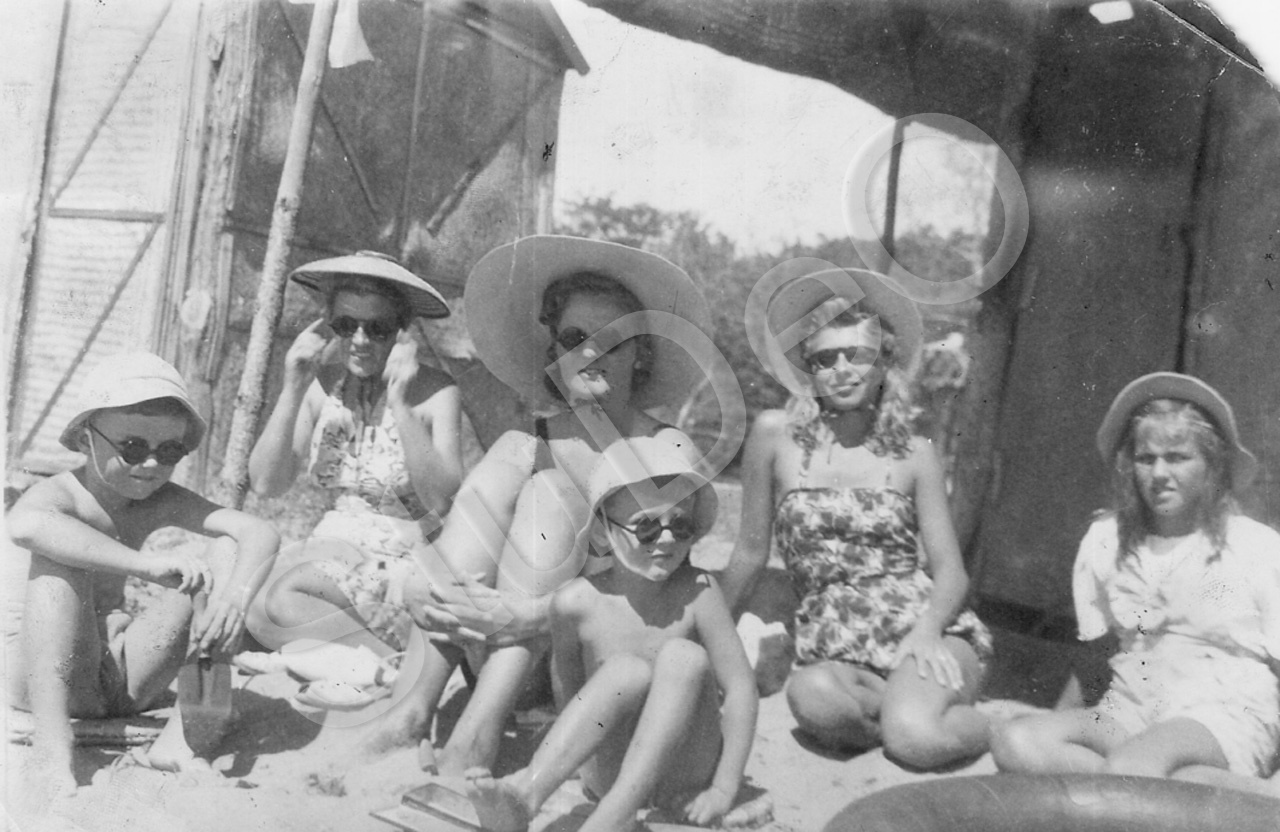 Beschreibung: Familien Kozer und Puck am Strand unter Strohsonnenschutz.
