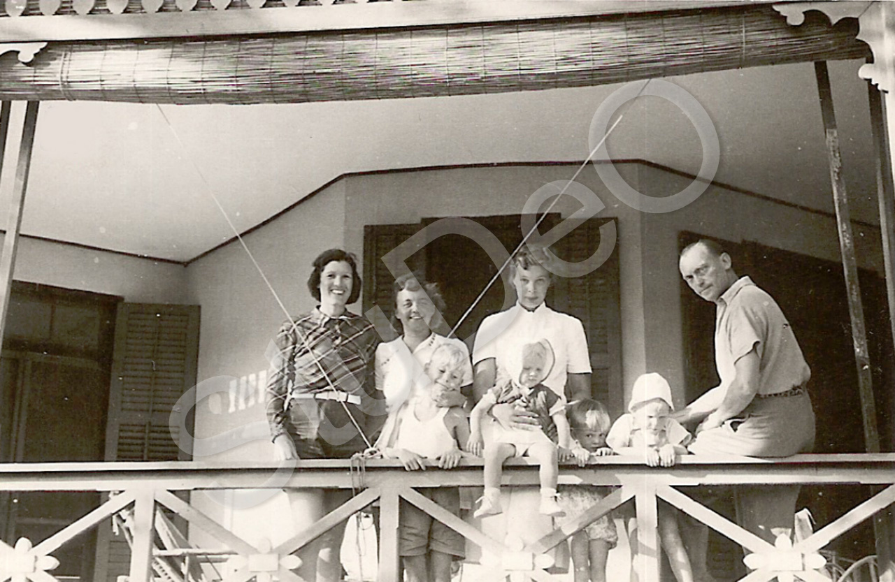 Beschreibung: Auf der Terrasse des Strandhauses der Familie Wilm, v.li.n.re. Lotte Wilm, Renata Steenken, unbekanntes Ehepaar, 4 Kinder.