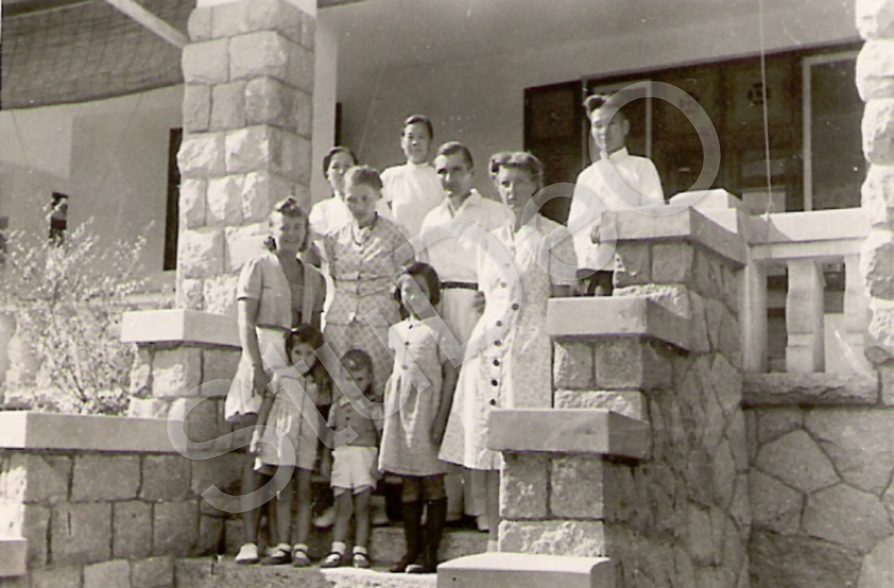 Beschreibung: Sommerhaus (auf einer Anhöhe mit Blick auf das Meer) von Gustav und Renata Steenken, letztere vorne li. mit der Familie Dr. Holzen und Bedienung. re. mit: Knopfleiste Elfriede Rösing.