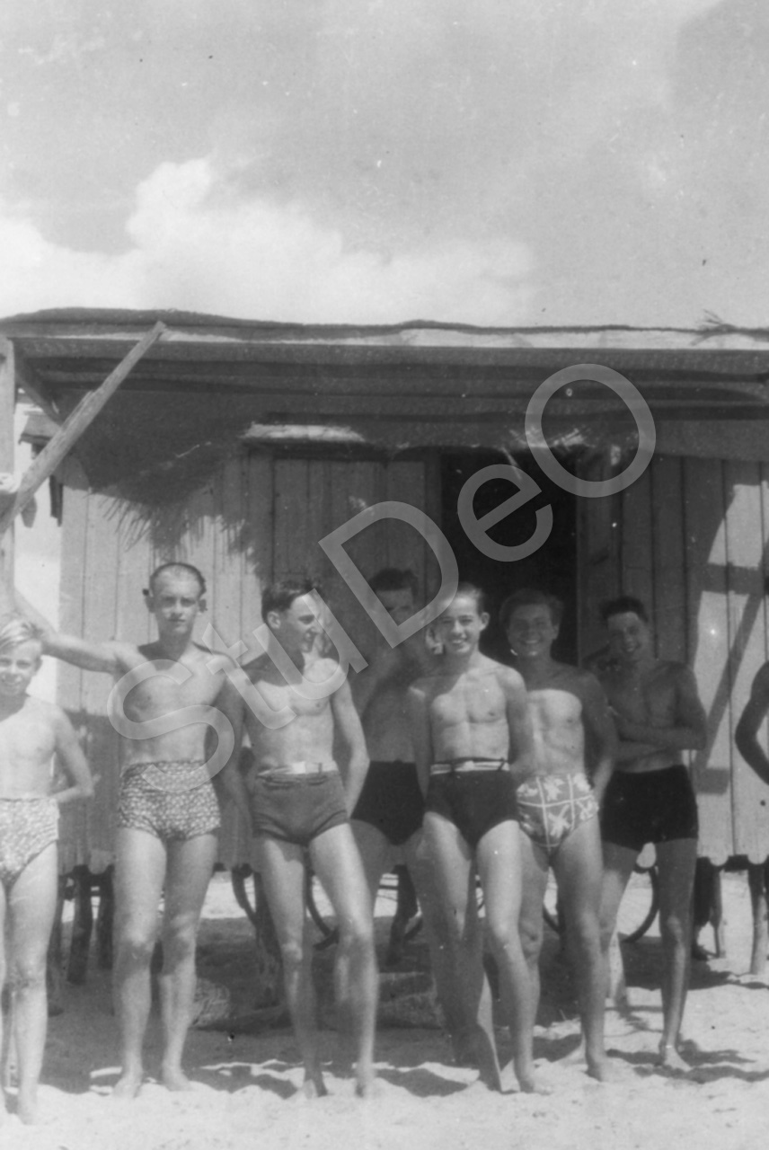 Beschreibung: „West-End Gruppe. v. li. n. re. Emmo Wissering (17 Jahre), Walter Fritz (16 J.), Franz Geyling (17 J.), Rüdiger Mock (15 J.), Herbert Arnhold (15 J.), Kurt Woltersdorf (15 J.), Martin Hudec (21 J.) (nur ein Arm sichtbar)“. Foto vom 28.08.1944.
