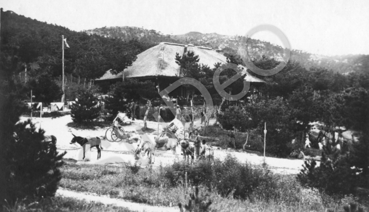 Beschreibung: Beladene Esel, Riksha und Chinesen vor einem europäischen Haus.