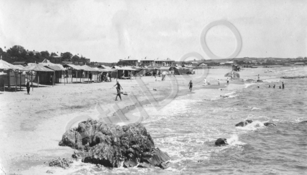 Beschreibung: Blick auf Wasser, Strand mit Strandhütten Richtung Osten.