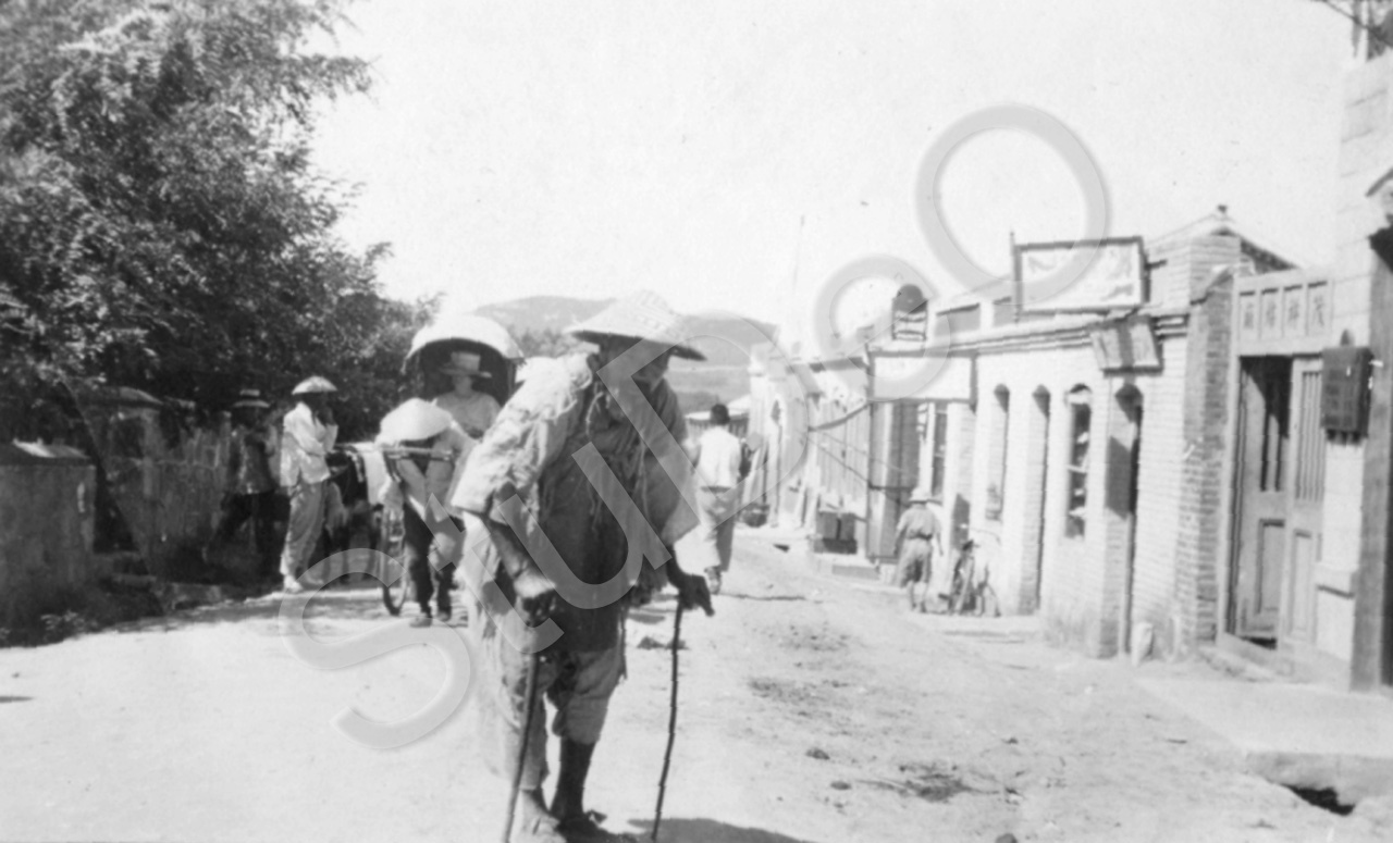 Beschreibung: Straße in Peitaiho Ort, alter Chinese, Riksha, Häuser.