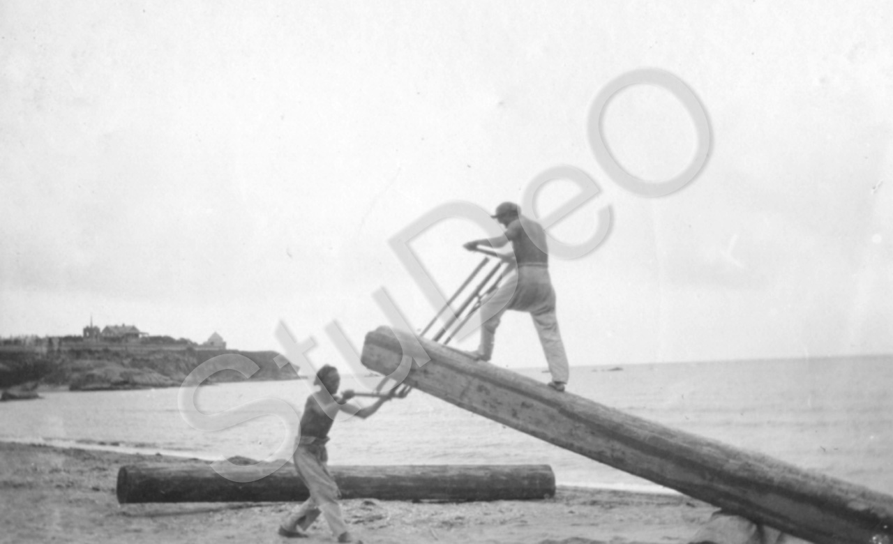 Beschreibung: Chinesen beim sägen eines Baumstammes am Strand nahe East Cliff.