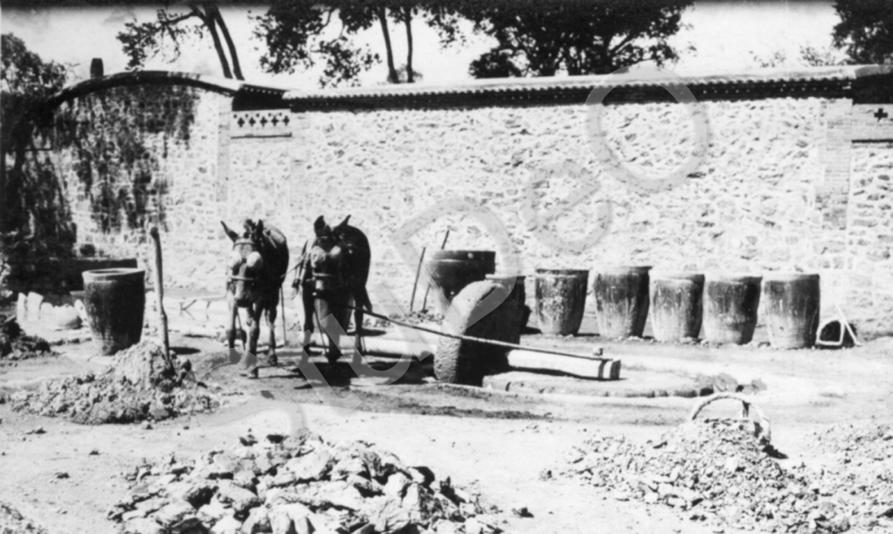Beschreibung: Zwei Esel mit verbundenen Augen drehen ein Mahlwerk.