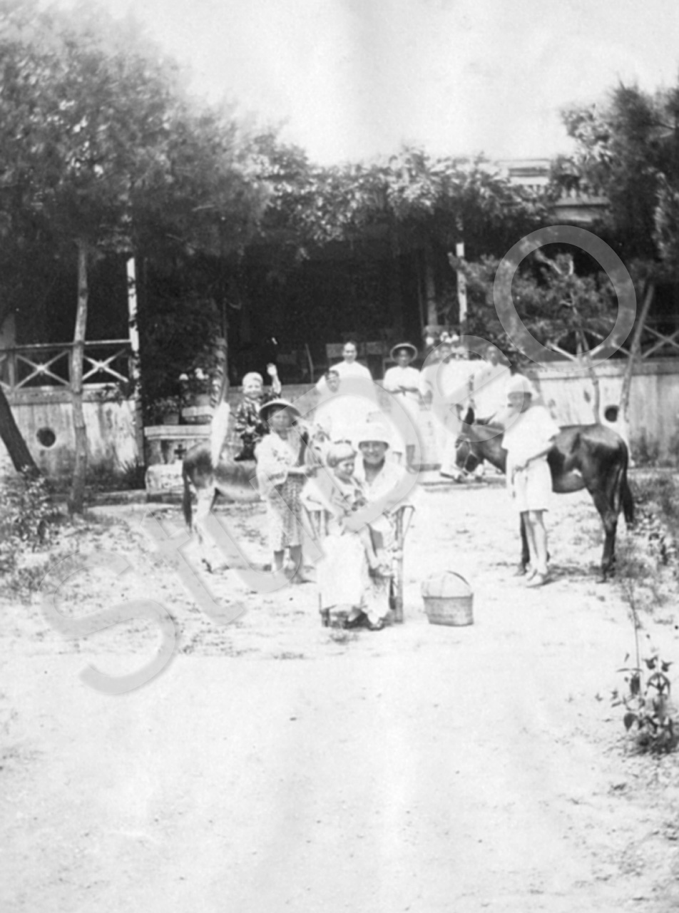 Beschreibung: Marie Balser und ihre Söhne auf Ferien im Cordes Haus. Im Hintergrund die Dienstboten.