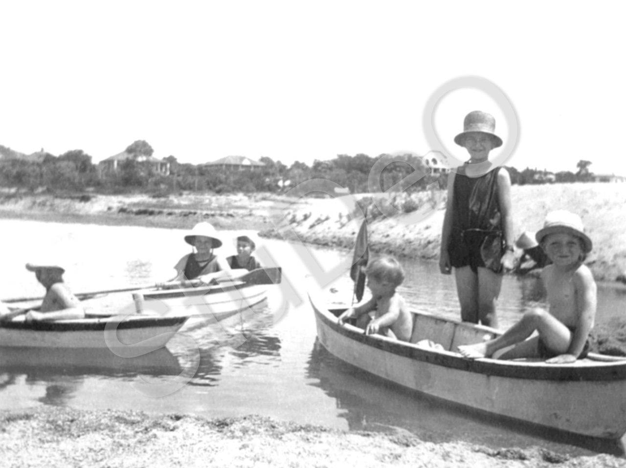 Beschreibung: Balser-Kinder mit Freunden Paddeln nah am Strand.