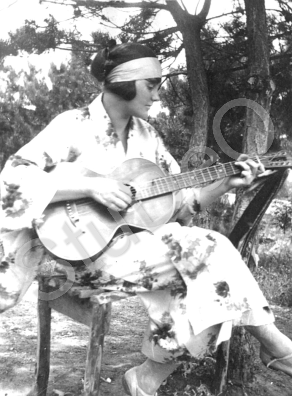 Beschreibung: Marie Balser spielt Gitarre im Garten.