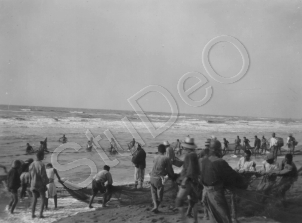 Beschreibung: Chinesen ziehen ein Netz aus dem Wasser am Strand.
