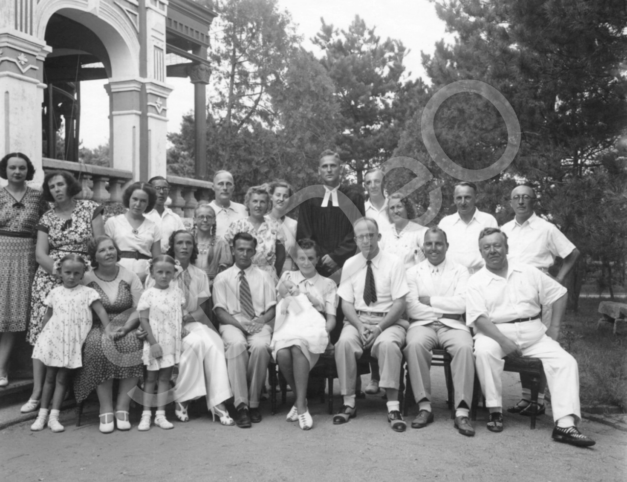 Beschreibung: Pastor Rosin mit der Taufgesellschaft für Baby von Peters. Unter den Gästen: Frau Traut (vom Konsul Traut in (Sh), Frau Marks (Ti) u. Tochter Irene, Michael Oberrenner, Dr. Maibom.