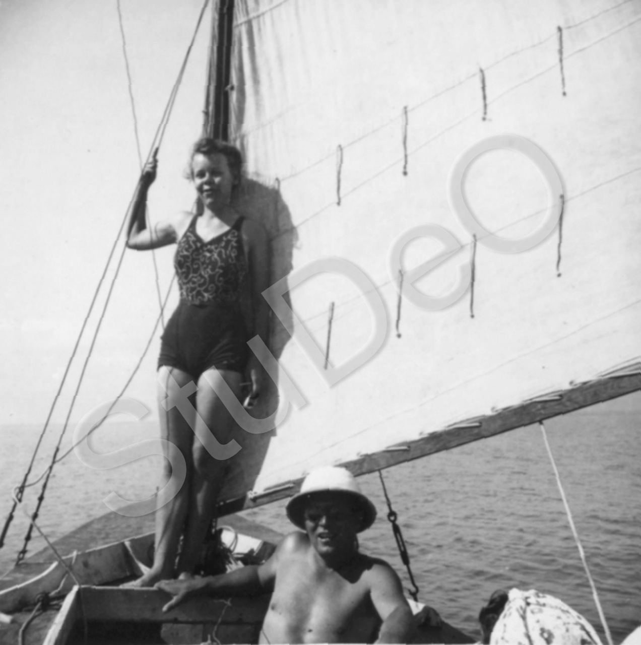 Beschreibung: Segelbot „Möve“ auf Fahrt. Am Mast Irmtraud Wittig. Im Boot W. Köhler. Wenn Dackel dabei, dann ist Frau Anner im Boot.