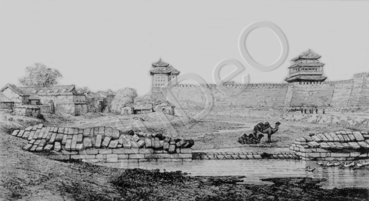 Beschreibung: Zeichnung  der Stadtmauer von Peking, rechts das Stadttor Hatamen. Kamele.