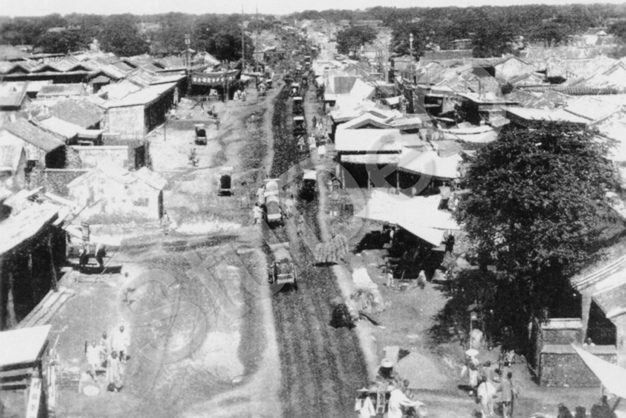 Beschreibung: Eine Lehmstraße mit Karren. Chinesische Häuser.