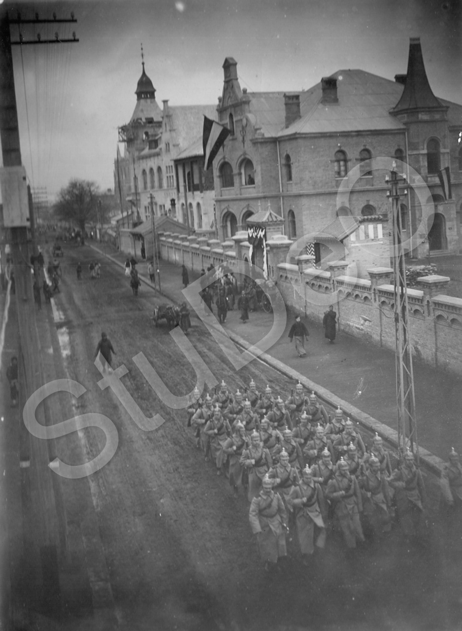 Beschreibung: Offiziere und Soldaten des III. SB marschieren auf der Legation Street (Richtung Osten) zur „Artillerie Gesandtschaftsschutzwache Peking des Ostasiatischen Detachements“ ein. Hinten franz. St Michaelkirche, davor die Deutsch Asiatische Bank (mit Kuppel). S. auch P5020.
