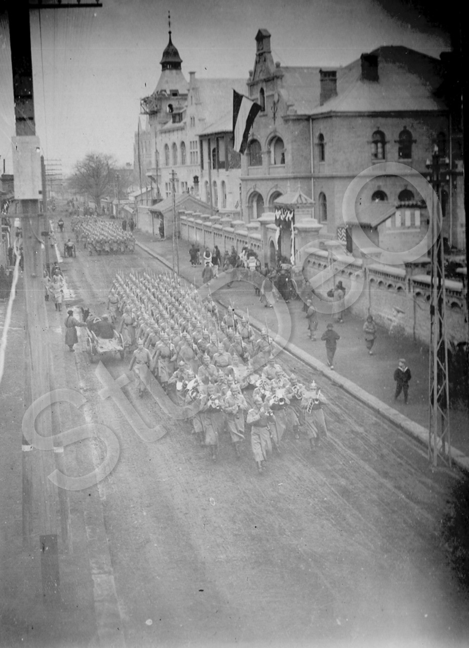 Beschreibung: Offiziere und Soldaten des III. SB marschieren auf der Legation Street (Richtung Osten) zur „Artillerie Gesandtschaftsschutzwache Peking des Ostasiatischen Detachements“ ein. Hinten franz. St Michaelkirche, davor die Deutsch Asiatische Bank (mit Kuppel). S. auch P5019.