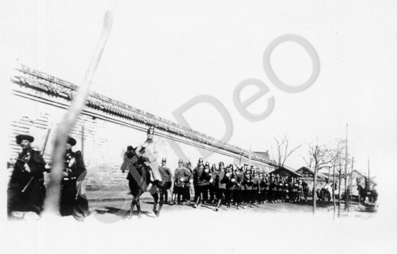 Beschreibung: Militärparade entlang einer Mauer? während den Revolutionswirren nach Absetzung des letzten Chinesischen Kaisers.