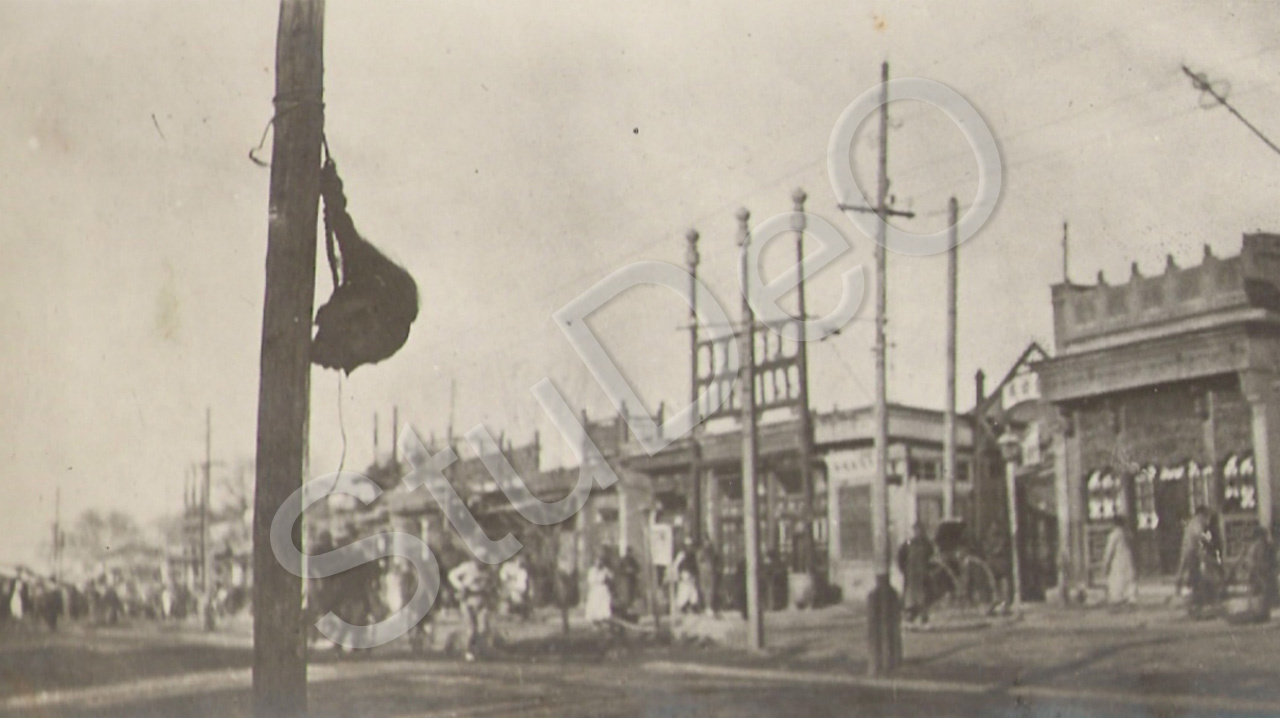 Beschreibung: Sicht eines Stadtteiles einen Tag nach der Meuterei in Peking. Der Kopf eines Plünderers häng an einem Pfahl.