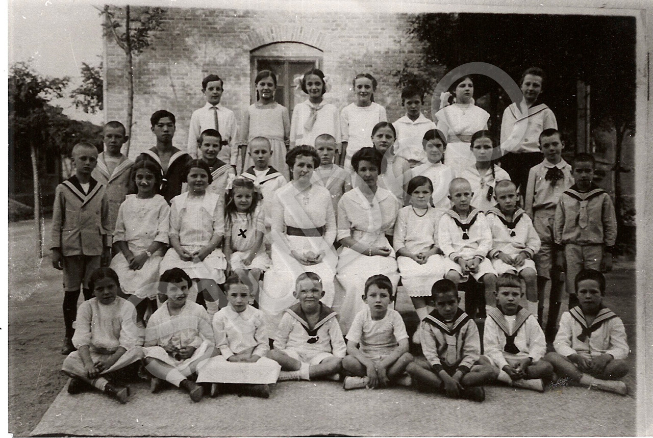 Beschreibung: Schüler der Deutsche Schule Peking, Schuljahr 1917/18. v.vorne li. n. re.: ?, Lilo Sterz, Klara Cordes, Hans Meier, Gustav Adolf Favorke, Ernst Cordes, Fredwin Pfeifer, Wilhelm “Bubi” Trendel, Gerhard Sauer, Mar­ga­rete Beinemann, Erika Lange, Ingeborg Herold, Frl. Lina Holland, Fr. Emma Arbs, Martha Hempel, Friedrich Quappe, Walter Quappe, Karli Cor­des, ?, Egon Hu, Fritz Modde, Emil Kröger, Hermann Kroeger, ?, Lot­te Cor­des, Hedwig Trendel, Karl Wilhelm Schmidt, Herbert Westphal, ?, Ilse Mothes, Lydia Rüscher, Hans Hellhoff, Olga Hempel, Gottfried Borkowetz.