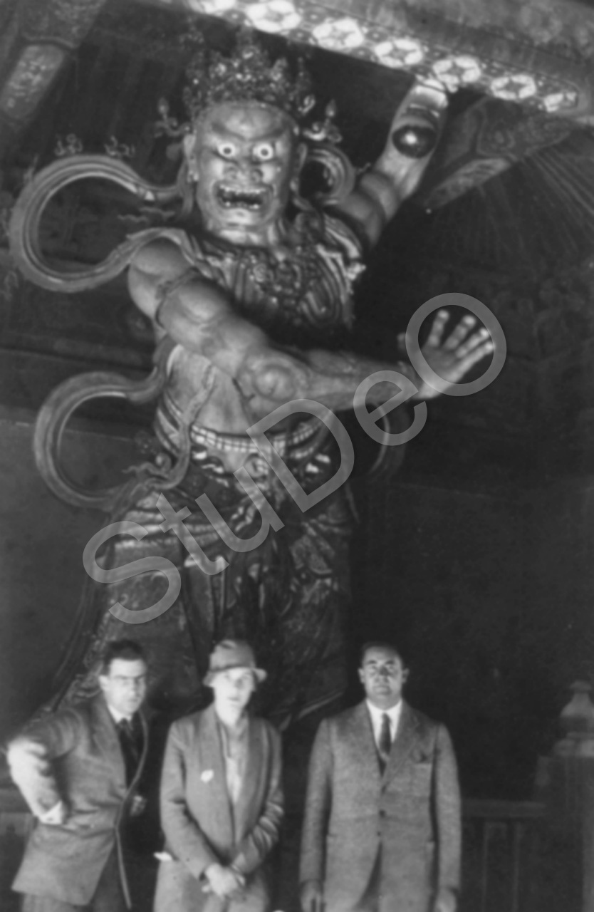 Beschreibung: Tempelfiguren (Geister o. Wächter) imTempel der Azurblauen Wolken, Byünse. Rechts Otto Hauer.