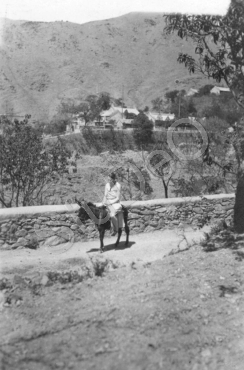 Beschreibung: Frau (Freundin von Otto Hauer?) reitet auf Maulesel. Im Hintergrund großes Anwesen auf einem Hügel.