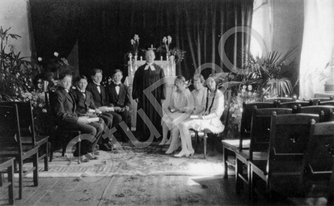 Beschreibung: Vor dem Altar in der Deutschen Evang. Kapelle Peking. Pastor Imma­nuel Heimerdinger  mit den Konfirmanden, v.l.n.r. Her­mann Basel, Christian Modde, Karl Ettinger, William von Klemm, Gretel Reitzig, Hilde Sterz, Suse Wang.