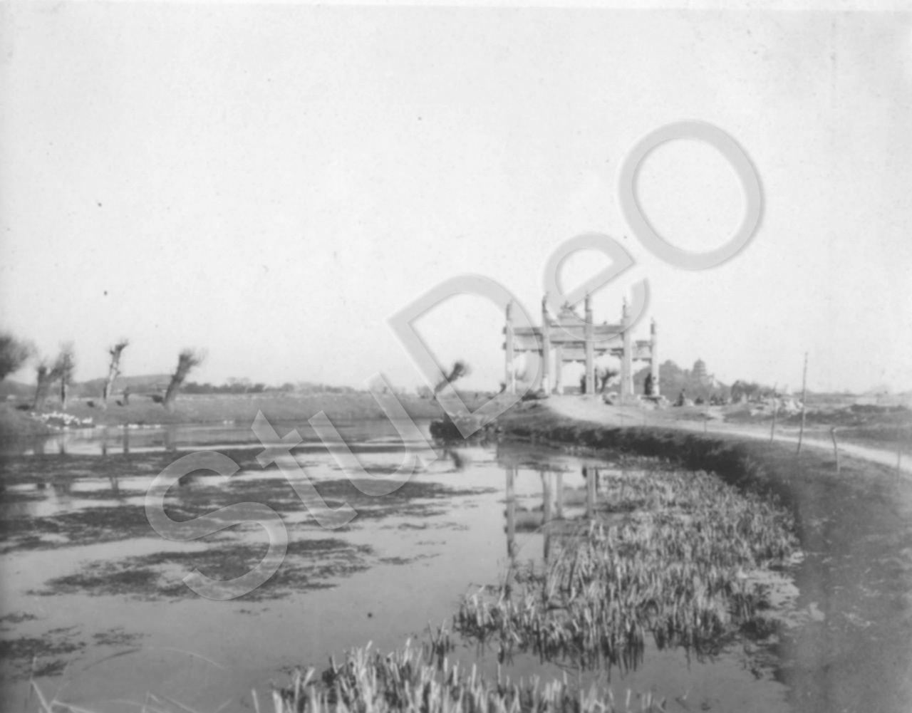 Beschreibung: Blick von der Jadequelle auf Brücke mit 2 Steinpeilus Richtung Osten zum Sommer­palast im Hintergrund. „Reitsausflug z. Edelsteinpagode“.