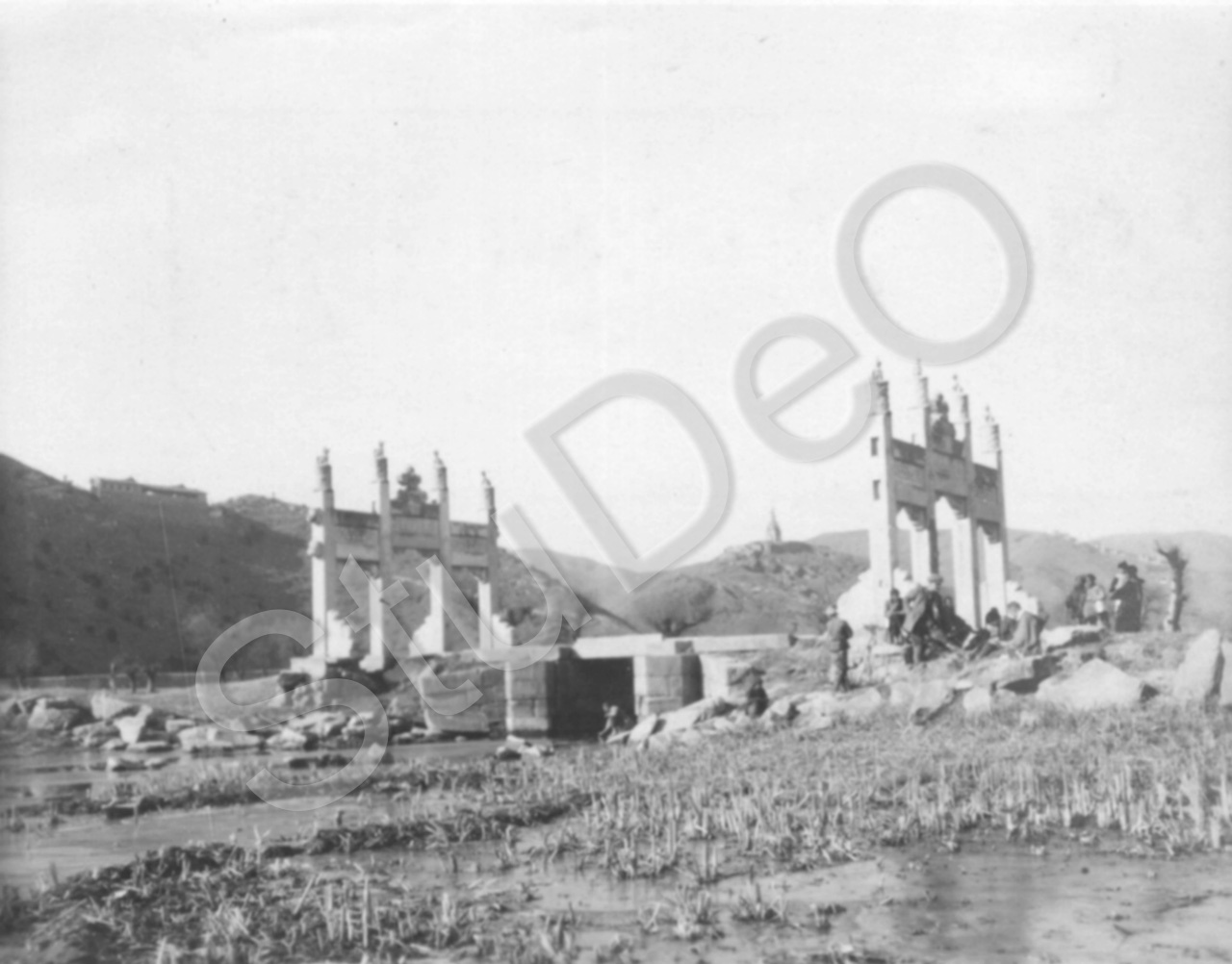 Beschreibung: Blick auf Brücke mit 2 Steinpeilus Richtung Norden im Hintergrund. „Reitsausflug z. Edelsteinpagode“. Reitergruppe macht Rast. Jadequelle.