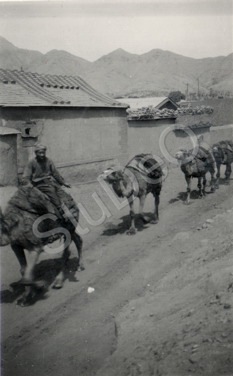 Beschreibung: Kamelkarawane auf Erdstraße zwischen dem Kohlebergbau Men tou ko (Westberge) und Pe­king. Begegnungen beim 8tä­gigen Ausflug von Schülern der Deutschen Schule Tientsin.