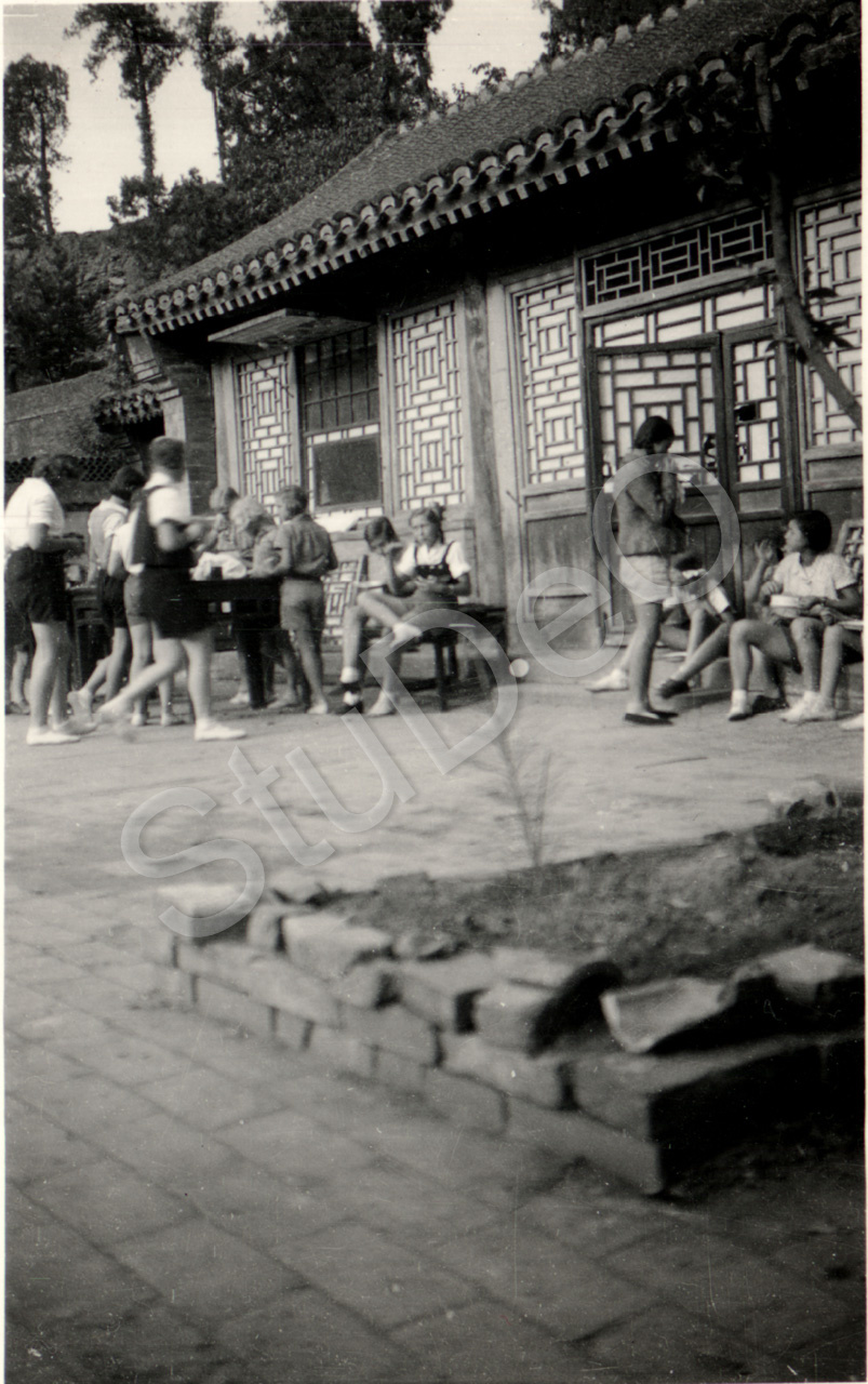 Beschreibung: Schüler der Deutschen Schule Tientisn rasten an einem Übernachtungs­tempel in den Westbergen. Große mit Rucksack: Eerika Wittich.
