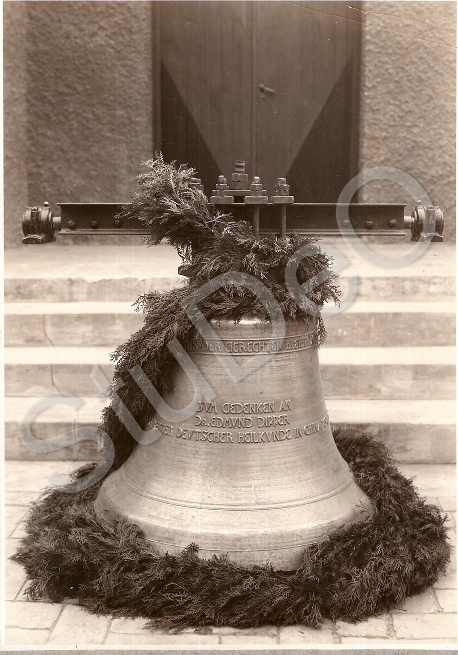 Beschreibung: Die Bronzeglocke (Ton B) für die  Dt. Ev. Kirche. Sie trägt die Inschrift: „Zum Gedenken an Dr. Edmund Dipper, Wegbereiter deutscher Heil­kun­de in China 1898-1933. Das Gedächnis der Gerechten bleibt im Segen“. Weihnachtsabend 1938 erklang sie zum ersten mal.