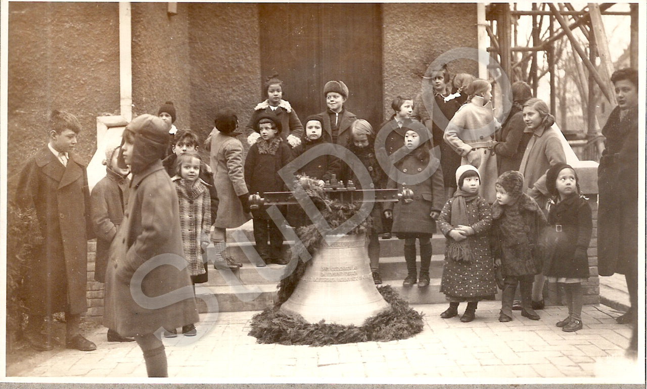 Beschreibung: Kinder der Gemeinde  vor dem Kirchentor um die Glocke stehend. V.l. Henry Vetch, vorne Günther Rothe, daneben Erika Rothe, dahinter Wolter v. Stael-Holstein, oben Liane Wang, Alex Romanovski, Friedel Heiss, Eberhardoder Wilhelm Haas?, Marthe Clemann, davor Chinese, oben an der Wand Imgard Marschall, Annelie Wilm, Ursel Marschall, ?, Lilo Wilfert, ganz r. Helferin im Kindergarten Linde Wang, vorne drei kleine Mädchen.