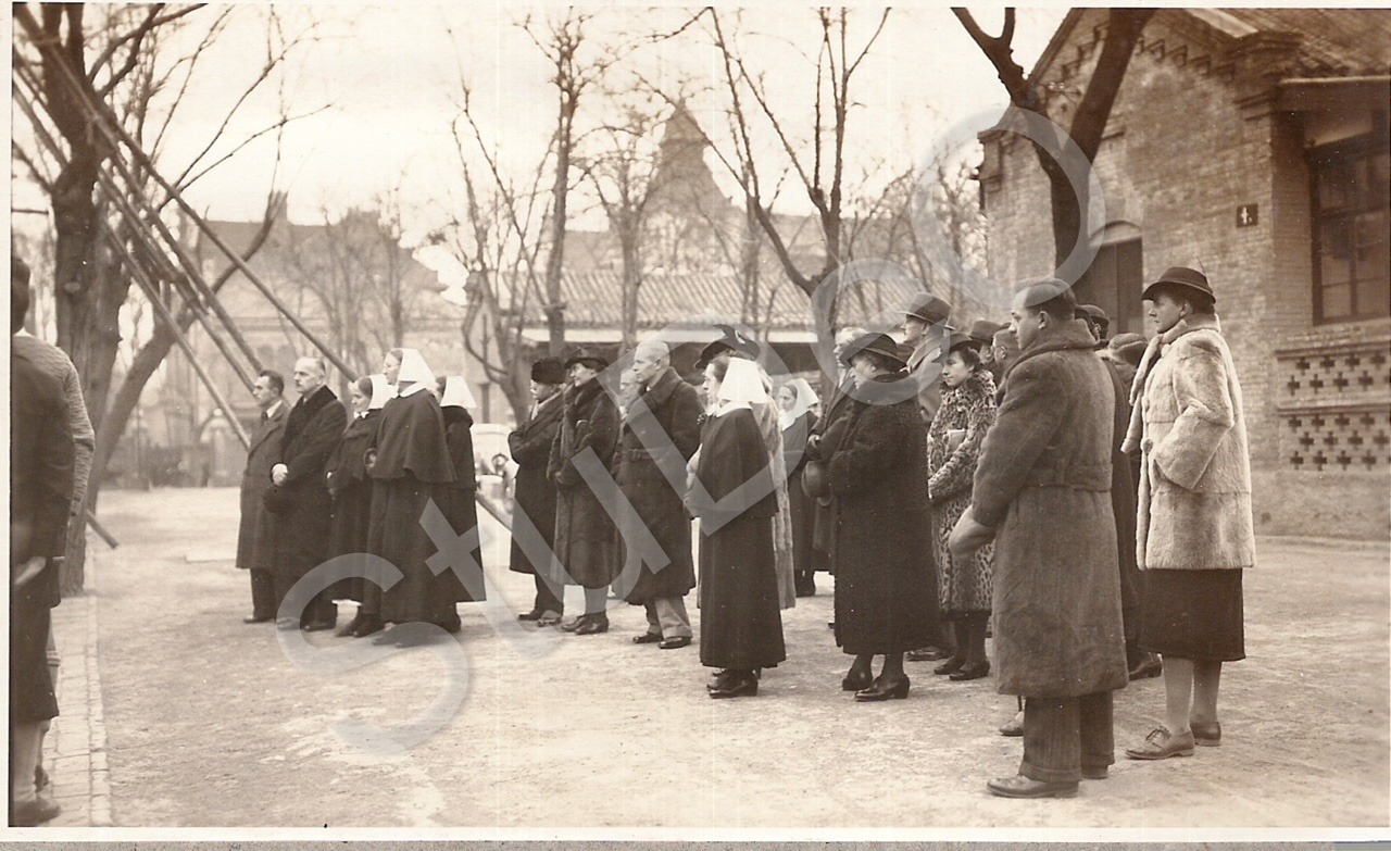 Beschreibung: Gemeinde hört neben der Kirche die Ansprache von Pastor Lehmann zum Aufzug der neuen Glocke. V.l.. Schuldirektor Dr. Gottfried Weiss, ?, drei Diakonissen Schwes­tern des Dt. Hospitals, ?, Frau Rothe, Dr, Kurt Stickforth , Schwester Julie, hinten nicht bekannt, Frau Trendel, ?, Inge Marschall, im Vordergrund  Kurt Heinze.