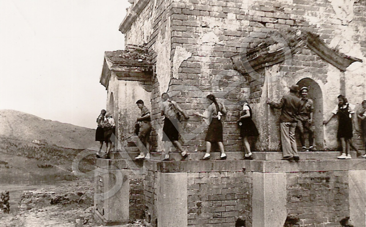 Beschreibung: HJ-Ausflug zur Jadequelle, auf Sockel einer Pagode stehend. 3.v.li. Dieter Theile, ?, Muschi Harpfinger, ?, Gustav Steenken, Dimitri Bouhoutsos (in Nische), Rosi Clemann, Friedl Heiss.